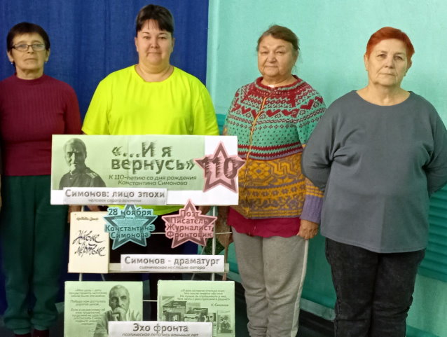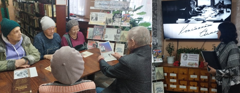 Участники встречи услышали рассказ о фронтовом пути Симонова-журналиста, прозвучали его стихотворения: «Жди меня», «Майор привез мальчишку на лафете…», которые стали настоящим гимном любви, верности и мужества. Узнали интересные факты из биографии писателя: что его настоящее имя – Кирилл и детство прошло в военных городках, а первый боевой опыт он получил еще в 1939 году на Халхин Голе и т.д. Что позволило глубже познакомиться с творчеством Симонова. Вспомнили его не только как писателя, но и как человека — его любовь и неизменную веру в Победу.